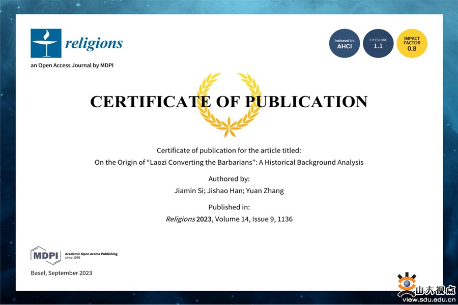 [本站讯]近日,韩吉绍教授团队在“老子化胡说”起源问题上取得了新的研究成果,以“On the Origin of ‘Laozi Converting the Barbarians’: A Historical Background Analysis”(论“老子化胡说”的起源:基于历史背景的分析)为题,在国际著名期刊Religions第14卷第9期正式发表。学院中国史专业博士研究生司家民为第一作者,韩吉绍教授为论文的独立通讯作者,山东大学历史文化学院为第一完成单位和通讯作者单位。