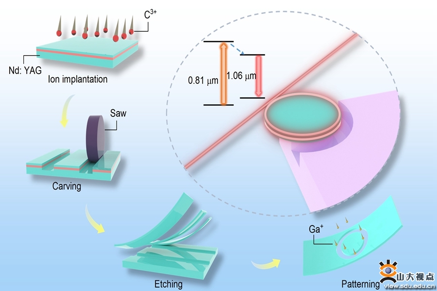 [本站讯]近日,物理学院陈峰教授团队在晶体薄膜制备和微腔激光方面取得新进展,提出了一种名为“离子注入增强选择性腐蚀方法”的技术,用于制备稀土元素掺杂的钇铝石榴石(YAG)单晶薄膜,并基于该材料制备微腔固态激光器,实现毫瓦级的激光输出。相关研究成果以"Optically pumped Milliwatt Whispering-Gallery microcavity laser"为题发表在光学领域期刊Light: Science & Applications(影响因子19.4)。该论文的第一作者是博士研究生李慧琦,通讯作者为谭杨教授、陈峰教授,合作作者包括王磊教授和博士研究生王赵聪。山东大学是该论文的第一作者单位和唯一通讯作者单位。