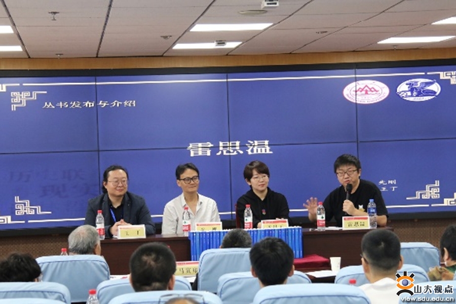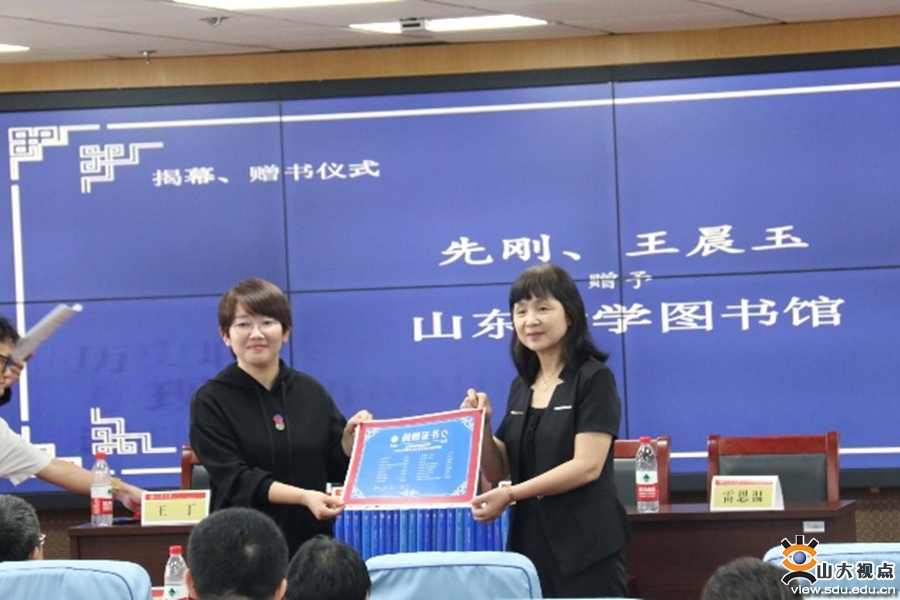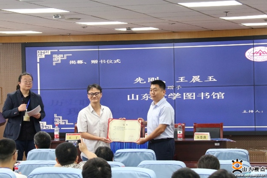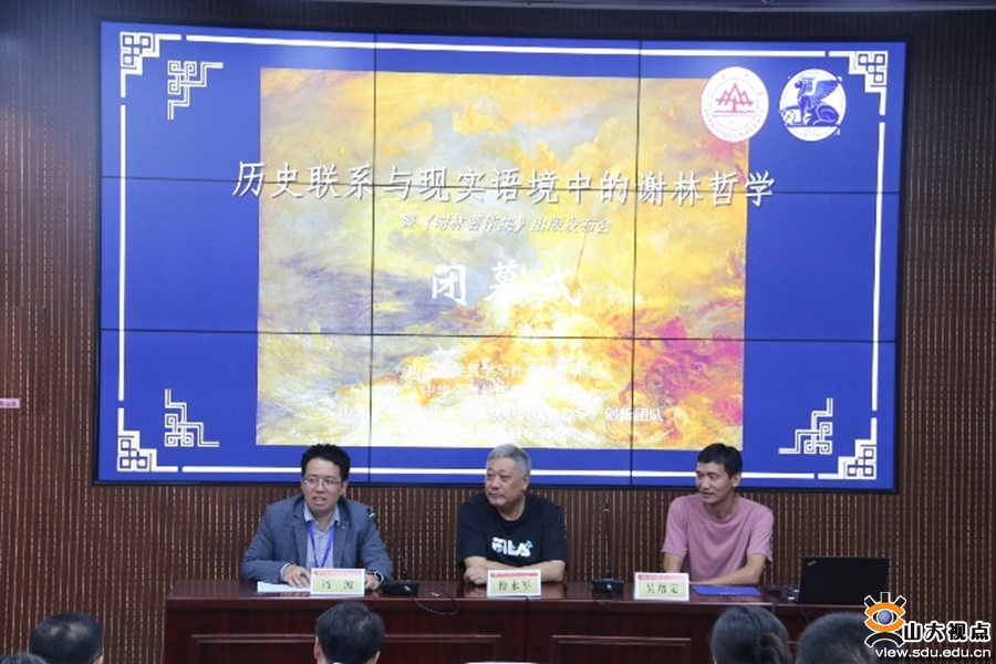 《谢林著作集》出版发布会由山东大学哲学与社会发展学院副教授王丁主持。《谢林著作集》主编先刚,责任编辑王晨玉,读者代表、中国人民大学哲学院副教授雷思温介绍著作集。先刚向山东大学图书馆捐赠已经出版的17卷《谢林著作集》,山东大学图书馆副馆长赵雷回赠收藏证书。王晨玉向山东大学哲学与社会发展学院资料室进行赠书。