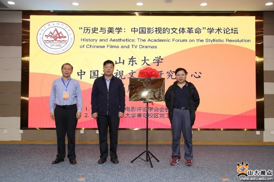 郭培良,著名电影批评家、中国电影评论学会会长饶曙光为“山东大学中国影视文体研究中心”揭牌。