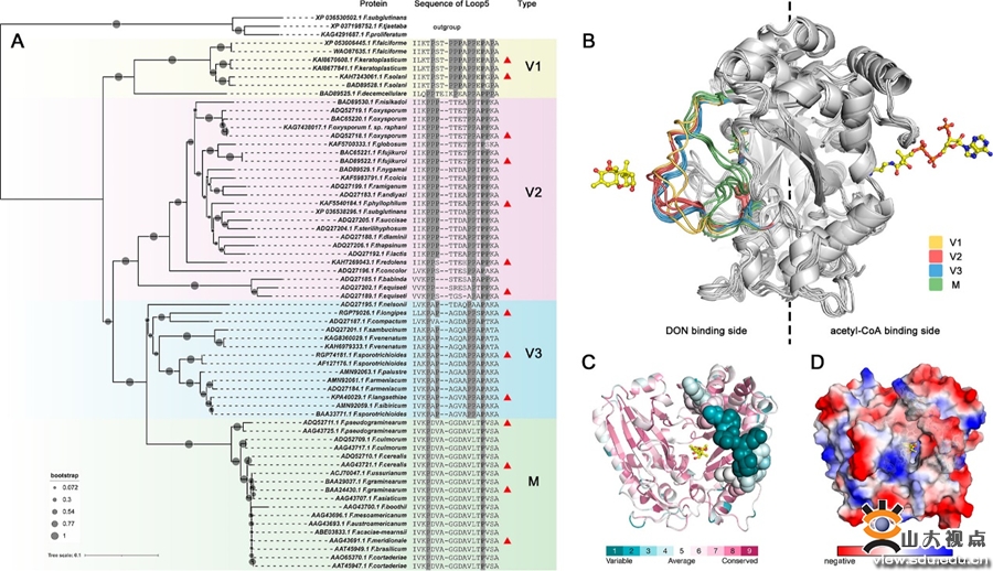 单端孢霉烯毒素乙酰化酶家族 TRI101/201可以实现对A/B型单端孢霉烯毒素的脱毒。但对TRI101/201的底物特异性和催化动力学的研究揭示了其家族内具有显著的催化效率差异,具体表现为对B型毒素的催化效率存在显著差异,而对A型毒素的催化效率保持相对一致。团队使用结构生物信息学分析,揭示了TRI101/201家族催化效率同进化的关系,发现了一段进化特异性的固有无序loop (loop cover),并依据loop cover序列提出全新的TRI101/201亚家族分类(V1/V2/V3/M)。同时利用牵引动力学模拟的增强采样流程,发现了活性口袋中控制底物结合的组分“疏水笼”,并证明loop cover在这些亚家族的结构中显示出不同的构象,使得其表现出破坏(V1/V2/V3)或增强(M)疏水笼的性质,进而影响亲疏水性不同的毒素在催化位点的结合效率。