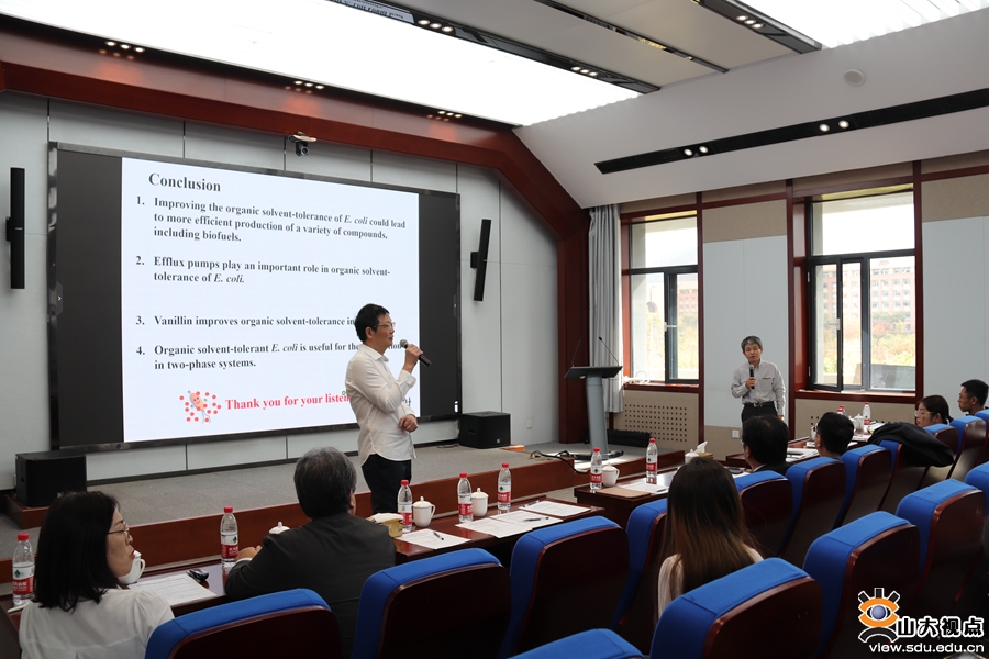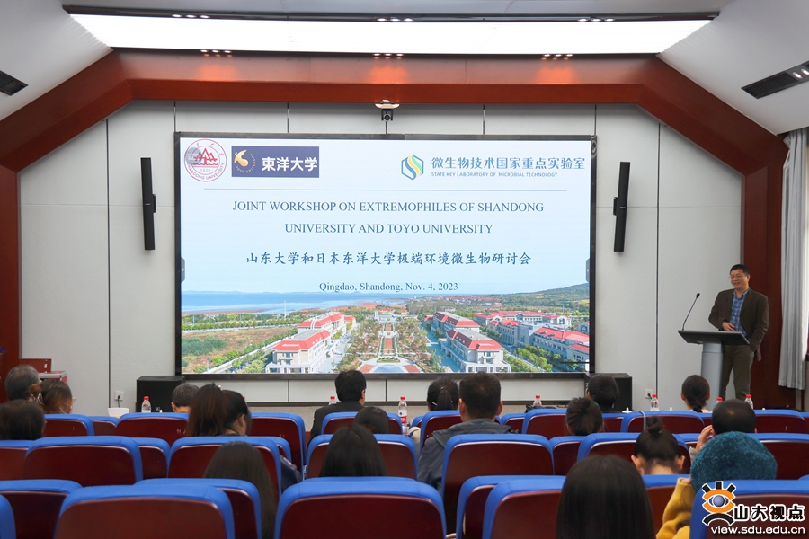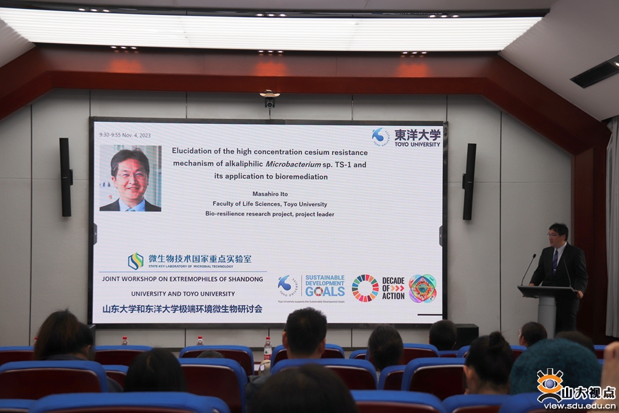 会上,佘群新教授、伊藤教授和申玉龙教授分别致辞。随后,会议分为四个小节、分别在日本东洋大学教授鸣海一成(Issay Narumi),佘群新教授,伊藤政博教授,山东大学微生物技术研究院研究员冯旭的主持下举行。中日双方10名报告人分别展示了山东大学和东洋大学在嗜碱微生物Microbacterium sp. TS-1高浓度铯抗性机制及其在生物修复中的应用,冰岛硫化叶菌(Saccharolobus islandicus)损伤响应网络揭示、纤维素降解能力提升、双载体表达系统构建、细胞分裂调控和单链DNA结合蛋白SSB的新功能,海洋嗜热细菌Defluviitalea phaphyphila褐藻降解酶的结构与功能鉴定,奇球菌(Deinococcus)新型穿梭载体构建、PprA蛋白在提升DNA损伤修复能力中的作用及在基因克隆中的应用,以及大肠杆菌耐有机溶剂能力改良等方面的最新进展。