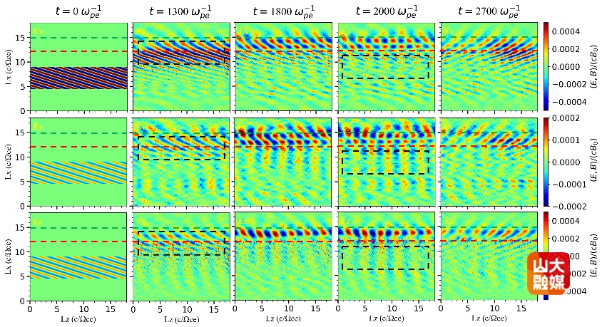 模拟表明,在典型土星磁层条件下,Z模在密度梯度区传播时,其轨迹类似光线在不均匀介质中的弯折。当Z模传播至Ellis窗口附近时,可有效转换为沿磁场方向传播的O模辐射。通过分析电磁场各分量的时空演化特征,成功识别出Z模与O模的波动信号,进而估算得到Z模到O模的能量转换效率为10%–20%。该效率远高于传统等离子体辐射过程中的非线性波模耦合效率(通常低于10⁻⁴)。