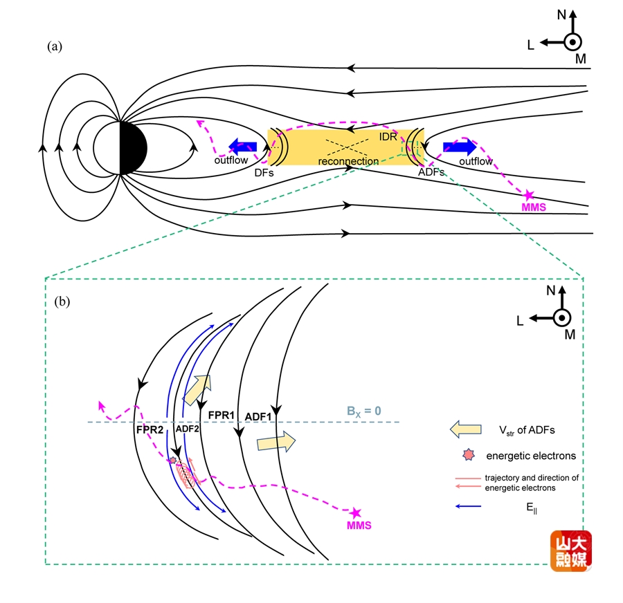 图2. MMS卫星穿越轨迹与反偶极化锋面加速高能电子的示意图