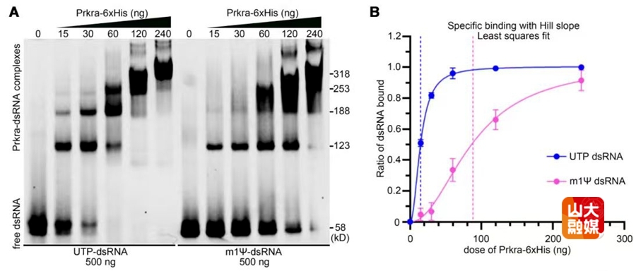 凝胶迁移实验(EMSA)结果表明,m1Ψ修饰可将 dsRNA与Prkra二聚体的结合亲和力降低至未修饰dsRNA的1/6。RNA pulldown实验证实,m1Ψ修饰显著削弱了dsRNA对翻译起始因子eIF2复合物的隔离作用。由此,即使IVT过程中仍有dsRNA副产物产生,m1Ψ修饰也能使其“隐身”,避免被Prkra识别,从而防止整体翻译抑制并确保高效蛋白合成。