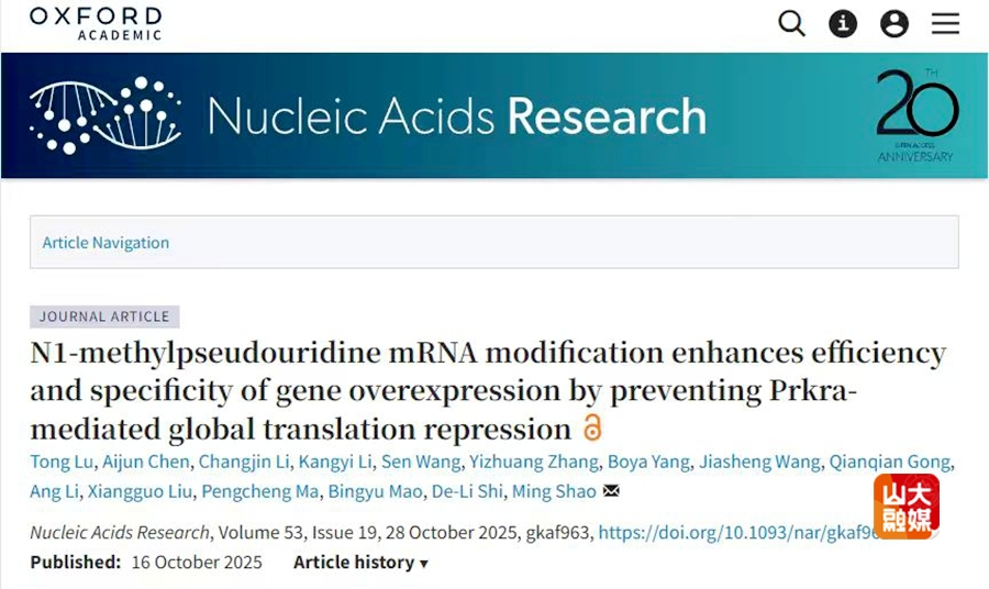 [本站讯]10月16日,生命科学学院邵明教授团队在Nucleic Acids Research杂志发表了题为“N1-methylpseudouridine mRNA modification enhances efficiency and specificity of gene overexpression by preventing Prkra-mediated global translation repression”的研究论文,系统揭示了体外转录mRNA(IVT mRNA)中dsRNA副产物对斑马鱼早期胚胎发育的有害影响,并发现N1-甲基假尿苷(m1Ψ)修饰可显著降低dsRNA副产物与感受器Prkra的结合,从而避免整体翻译抑制所导致的胚胎毒性。该研究不仅为提高mRNA在胚胎中应用的特异性提供了思路,也揭示了m1Ψ修饰减轻应激反应、推动mRNA疗法应用的一种潜在机制。