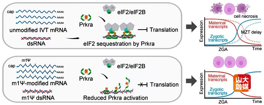 在分化细胞中,研究已表明假尿苷(Ψ)能够有效降低包括 RIG-I、PKR 和 TLR3 在内的 RNA传感器对dsRNA的识别。值得注意的是,m1Ψ修饰的mRNA比Ψ修饰引发更弱的免疫反应,同时维持更高的翻译效率。然而,这些研究主要集中于分化细胞。在早期胚胎中,经典 dsRNA 受体并不活跃。邵明教授团队此前发现,在早期胚胎中,二聚化的Prkra 是主要的dsRNA识别分子,可触发类似整合应激反应的整体翻译抑制,但这一机制对IVT mRNA应用的影响仍不清楚。同时,m1Ψ修饰是否以及如何调控Prkra介导的应激反应也尚未揭示。