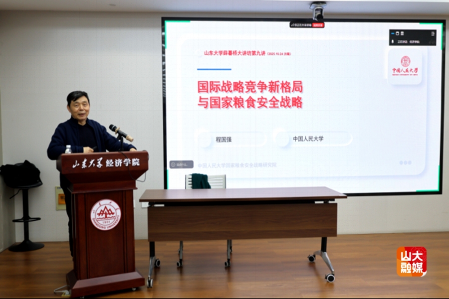 [本站讯]10月24日,经济学院“薛暮桥大讲坛”于中心校区举行,中国人民大学吴玉章讲席教授程国强作题为“国际战略竞争新格局与国家粮食安全战略”的学术报告。讲座由山东大学经济学院常务副院长石绍宾主持。
