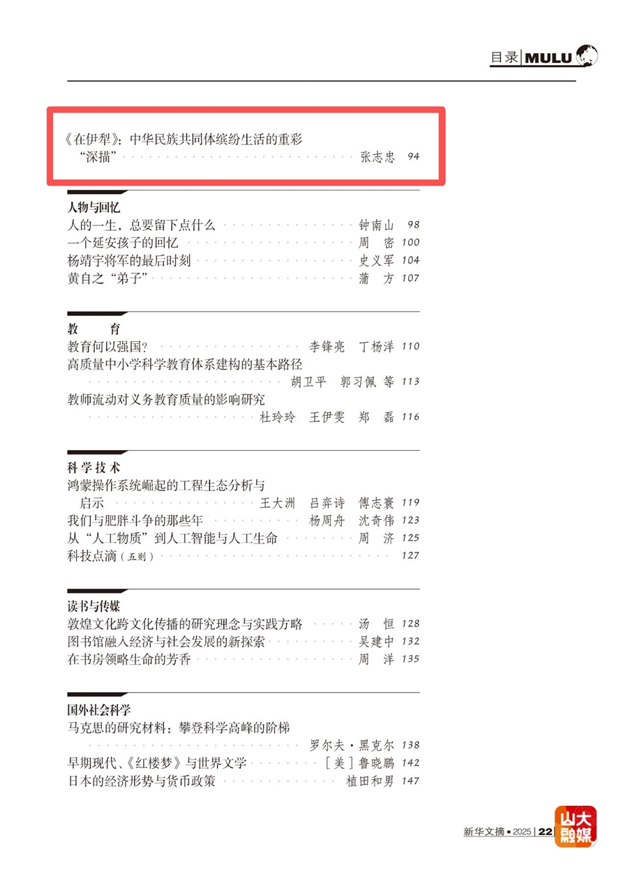[本站讯]人文艺术研究院教授张志忠的论文《<在伊犁>:中华民族共同体缤纷生活的重彩“深描”》被《新华文摘》2025年第22期主体转载。