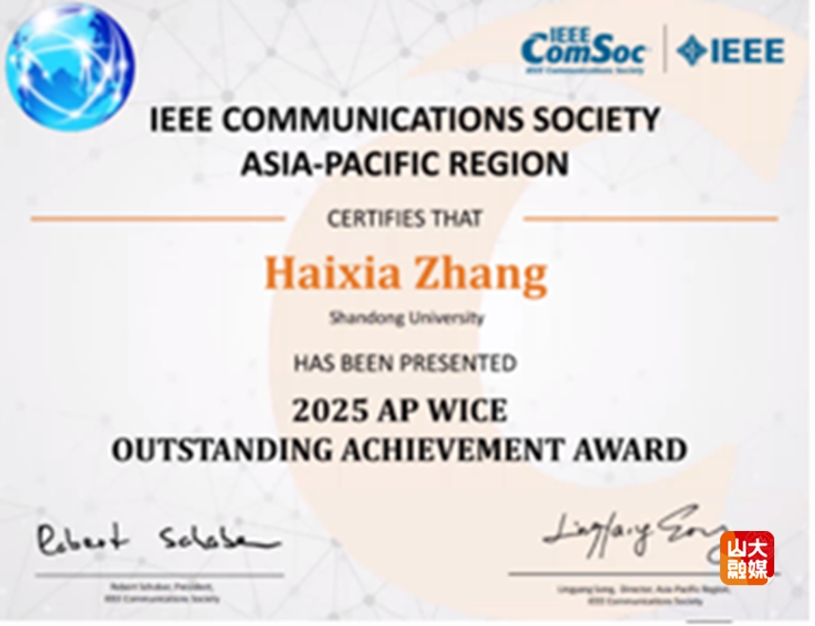 [本站讯]近日,国际电气与电子工程师学会(IEEE)通信学会(ComSoc)公布了2025年度亚太地区Women in Communications Engineering(WICE)奖项评选结果。山东大学教授张海霞获得2025 AP WICE Outstanding Achievement Award(杰出成就奖),该奖项授予亚太地区在通信工程领域取得突出科研成果与卓越国际影响力的女性学者,每年1人,是具有广泛国际认可度和影响力的学术荣誉。