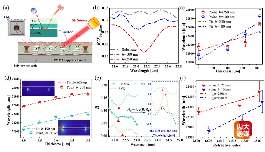 团队提出一种基于SPhPs的超薄 SrTiO3/Ge 混合超表面,突破典型FIR器件对厚度的依赖性瓶颈问题。全波数值模拟表明,以SrTiO3作为SPhPs传输介质、以高折射率Ge作为极化近场扰动元原子,可在超薄几何下实现强共振与高效耦合。研究揭示了高频与低频Reststrahlen带内局域LSPhPs共振行为差异的物理起源。此外,采用光谱椭圆仪测量了2-30μm 波段吸收光谱与椭偏参数,成功捕捉到~22μm 处的强共振,从而为机理解释提供了额外证据。与传统声子‑极化激元平台相比,该超表面呈现角度无关的共振特性,并实现了较高品质因数(Q≈100)。基于上述特性,开展了聚合物检测的概念验证,证明了远红外模式可实现高效的厚度传感与材料识别。本工作展示了在长波共振与超薄器件之间实现协同的设计路径,为超薄FIR超表面器件的开发提供了新的思路。