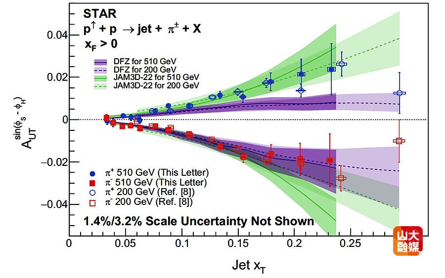 STAR研究团队精确测量了510GeV对撞能量下质子-质子碰撞喷注中强子的单自旋不对称,即Collins效应,并与 200GeV能量下的结果相比较,首次发现在相同喷注动量分数xT标度下,两个能量下的结果很好地吻合在一起。相同的动量分数标度消除了初态横向自旋分布函数的影响,而两个能量下的QCD标度相差接近6倍,因此该能量无关性表明Collins函数的标度演化效应非常微弱,为Collins函数提供了重要约束,这是QCD研究的重要进展,也是山东大学中高能核物团队依托STAR实验在自旋物理领域取得的又一个重要成果。