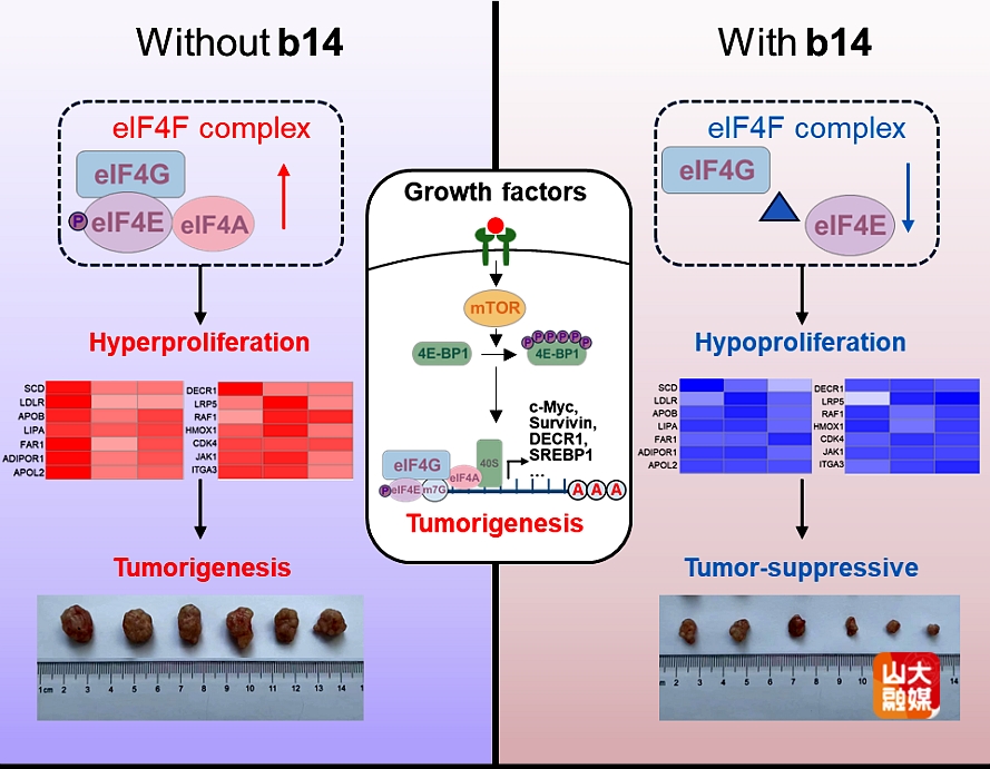 综上所述,噻唑环衍生物b14通过阻断eIF4E/eIF4G相互作用,破坏翻译起始复合物eIF4F组装,影响肿瘤进程相关蛋白表达,破坏线粒体稳态和肿瘤细胞能量代谢,在细胞水平和动物水平显著抑制肿瘤细胞增殖。b14的发现有望为后续eIF4E抑制剂在抗肿瘤药物中的开发提供了新的理论基础。