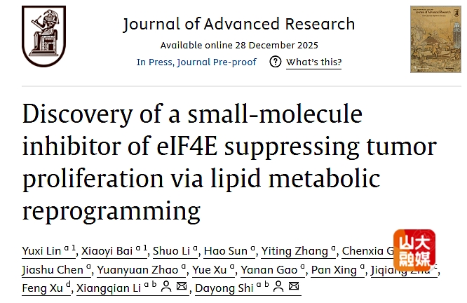 [本站讯]近日,山东大学微生物改造技术全国重点实验室史大永教授团队在eIF4E/eIF4G阻断抑制剂抗肿瘤领域取得重要进展,在Journal of Advanced Research期刊发表了题为“Discovery of a Small-Molecule Inhibitor of eIF4E Suppressing Tumor Proliferation Via Lipid Metabolic Reprogramming”的研究论文。博士后林遇溪、硕士研究生白晓易为论文共同第一作者,史大永教授和李祥乾副研究员为共同通讯作者,山东大学微生物改造技术全国重点实验室为第一完成单位和通讯作者单位。