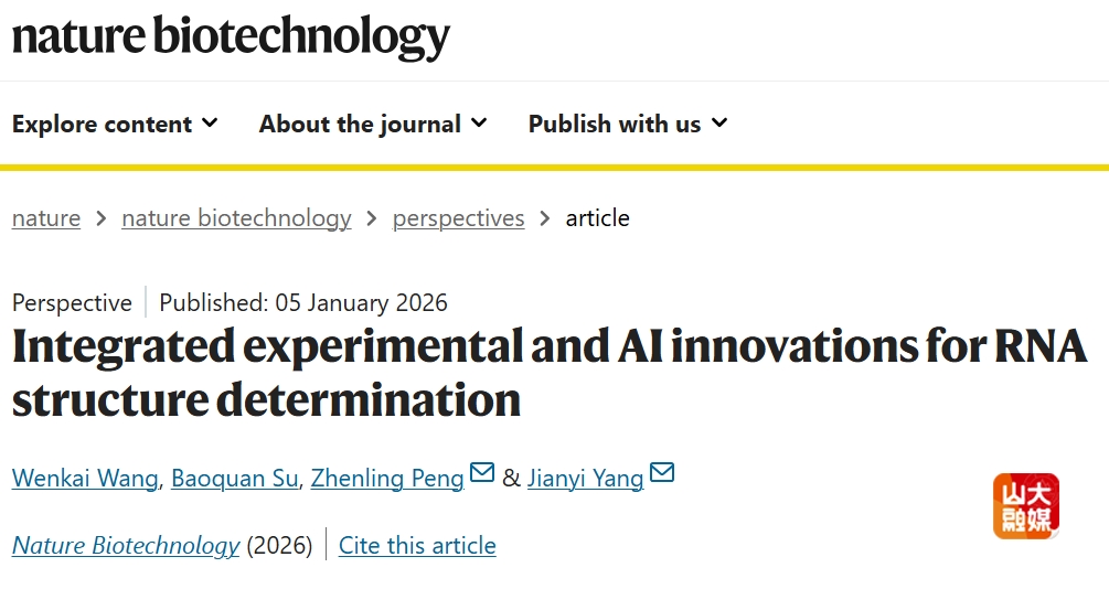 [本站讯]近日,山东大学数学与交叉科学研究中心、教育部非线性期望前沿科学中心杨建益教授团队在生物学权威期刊Nature Biotechnology(IF:41.7)发表题为“Integrated experimental and AI innovations for RNA structure determination”的观点(Perspective)文章。该文章系统性回顾了RNA结构测定领域的最新革命性进展,深刻剖析了实验技术与人工智能(AI)从“并行发展”走向“深度融合”的变革趋势,并为解析RNA世界的复杂性提供了前瞻性的路线图。数学与交叉科学研究中心博士后王文恺、博士研究生苏宝泉为论文共同第一作者,杨建益教授、彭珍玲教授为共同通讯作者,山东大学数学与交叉科学研究中心为唯一完成单位。