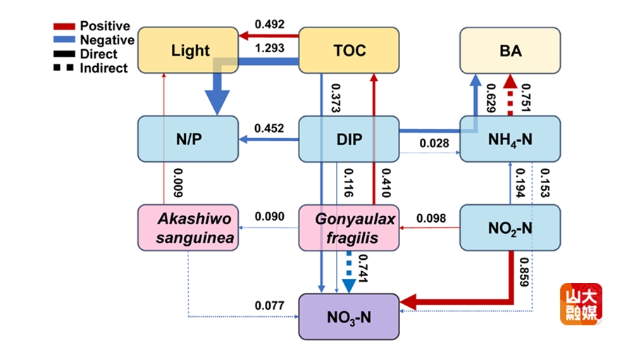 研究团队在山东荣成海带(Saccharina japonica)养殖区的减产年份和正常年份开展了实地调查。结果表明,海带减产年份期间海水中硝氮(NO3-N)浓度低至0.23 µmol L⁻1,仅为正常年份浓度的4.60%,且其氮磷比(N/P)下降至2.54。与此同时,减产年份爆发了由红色赤潮藻(Akashiwo sanguinea)和膝沟藻(Gonyaulax fragilis)引起的赤潮。根据PLS-PM模型结果可知(图1),G. fragilis和A. sanguinea,即赤潮藻种与硝氮呈现负相关关系(路径系数:0.741,0.077)。这表明赤潮藻种大量消耗海带养殖区可利用的营养盐,导致该海区出现严重的氮限制。本调查研究强调了营养物质可利用性对大型藻类生物量的重要影响。这将有助于解析利用大型藻类养殖实现海洋增汇的外部条件,为缓解气候变化提供案例支撑。