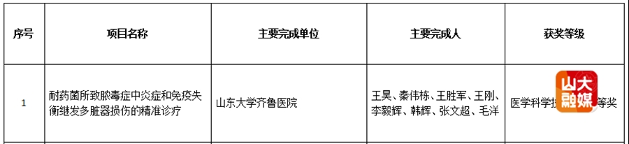 [本站讯]1月14日,中华医学会公布2025年中华医学科技奖评审结果,山东大学齐鲁医院重症医学科主任王昊团队凭借《耐药菌所致脓毒症中炎症和免疫失衡继发多脏器损伤的精准诊疗》项目,获医学科学技术奖二等奖。