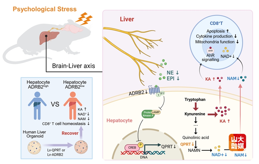 [本站讯]肝脏作为代谢与免疫的关键器官,分布着丰富的神经末梢,然而心理压力究竟如何影响肝脏稳态,其机制并不明确。近日,基础医学院马春红教授/梁晓红教授团队研究发现,慢性应激破坏脑-肝回路,打破肝细胞色氨酸代谢平衡,从而抑制肝脏CD8+T细胞免疫应答,加速肝病进展的新机制。相关研究以“Chronic stress drives liver cancer by impairing the hepatic kynurenine pathway and immune surveillance”为题发表在Nature Metabolism杂志,梁晓红教授为通讯作者,博士研究生孙仁慧为第一作者,山东大学为第一作者和通讯作者单位。