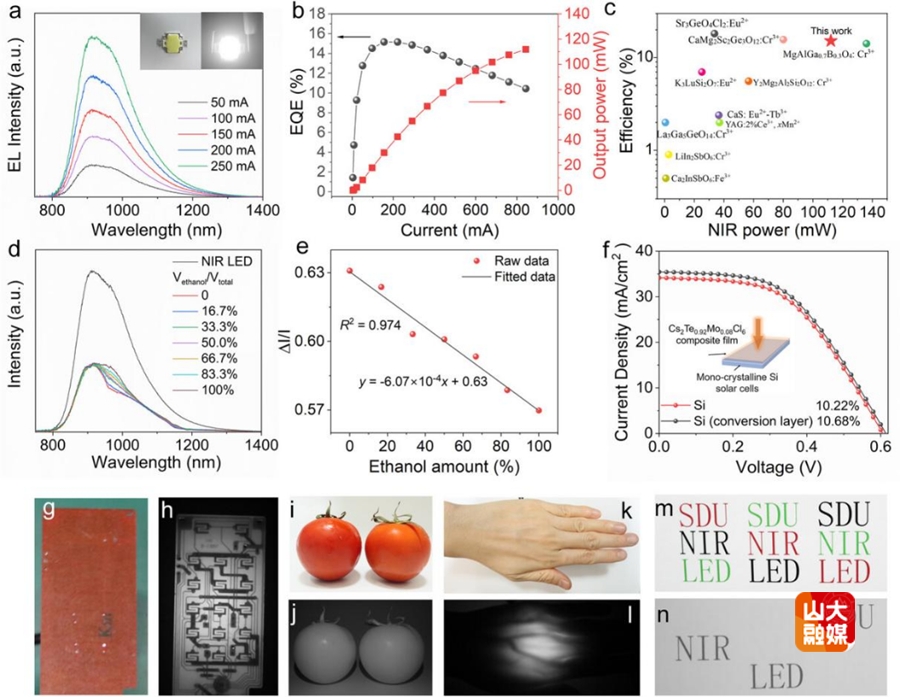 针对近红外发光的 EQE 停滞问题,王亮、于伟泳教授团队联合吉林大学郑传涛教授、中南大学肖泽文教授团队,提出协同优化AE 与 IQE 的新策略,设计出无铅钙钛矿单组分固溶体材料 Cs2Te0.92Mo0.08Cl6。该材料实现750-1350 纳米宽带近红外发射,内部量子效率达 97.4%,在超过 900 纳米的宽带近红外荧光粉中创下 65.6% 的外部量子效率纪录;其卓越性能源于强光子捕获、低声子能量及 I 型能带对齐的协同效应。此外,该材料稳定性优异,基于 395 纳米紫外芯片制备的近红外 LED,电光转换效率达 15.2%、光输出功率达 112 mW,且在乙醇浓度检测、太阳能收集、夜视及防伪领域验证了实际应用价值。相关工作以“Unlocking High External Quantum Yield for Broadband Near-Infrared Emission From Lead-Free Perovskite Variant Solid Solutions Cs2Te1‒xMoxCl6”为题发表在Advanced Materials。山东大学博士后李鑫为论文第一作者,王亮教授为核心通讯作者,山东大学为第一作者单位及核心研究单位。