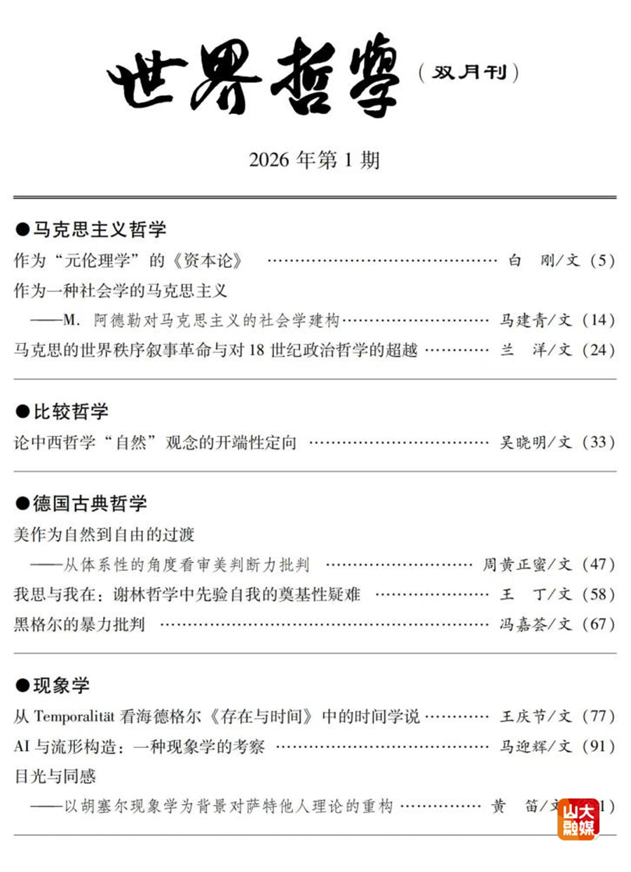 [本站讯]近日,哲学与社会发展学院教授王丁在《世界哲学》2026年第1期发表题为《我思与我在:谢林哲学中先验自我的奠基性疑难》的论文。