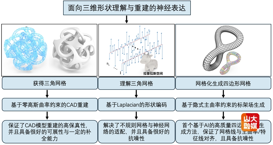 论文聚焦“几何AI+CAX”,面向“获得—理解—网格化”全链条提出系统方法,在CAD曲面重建、网格理解与高质量四边形网格生成等方向形成系列成果,为智能制造和制造业数字化转型提供了关键技术支撑。在CAD模型重建方面,利用CAD模型表面分片光滑的特点,解决了已有技术难以重建高质量的复杂CAD模型的痛点,大幅提升了重建过程的鲁棒性与输出质量。在网格理解与分析方向,提出Laplacian2Mesh突破了传统神经网络处理不规则三角网格的瓶颈,显著提升了神经网络处理三角网格形状的准确性与鲁棒性,该成果入选ESI高被引论文。在网格生成方面,提出了基于深度学习的四边形网格生成技术,该方法开创了无监督优化生成四边形网格的先河,有效克服了传统方法难以兼顾多尺度几何特征的难题,显著提升了网格质量。