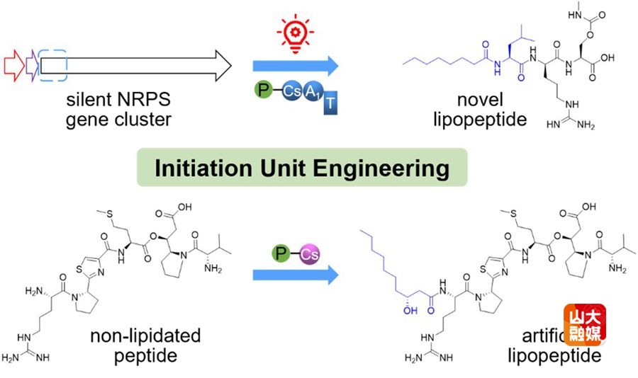 [本站讯]近日,山东大学微生物改造技术全国重点实验室卞小莹教授课题组在非核糖体肽类微生物次级代谢产物的挖掘与改造领域取得新进展,相关研究成果以“Accessing Underexplored Biosynthetic Potential by Initiation Unit Engineering of Nonribosomal Peptide Synthetases in Proteobacteria”为题,发表于国际著名期刊《美国化学会志》(Journal of the American Chemical Society, JACS),该研究首次提出起始单元工程策略,并应用于激活沉默脂肽基因簇和人工创制脂肽,为深入拓展微生物生物合成潜力提供了新思路。山东大学微生物改造技术全国重点实验室为第一作者和通讯作者单位。