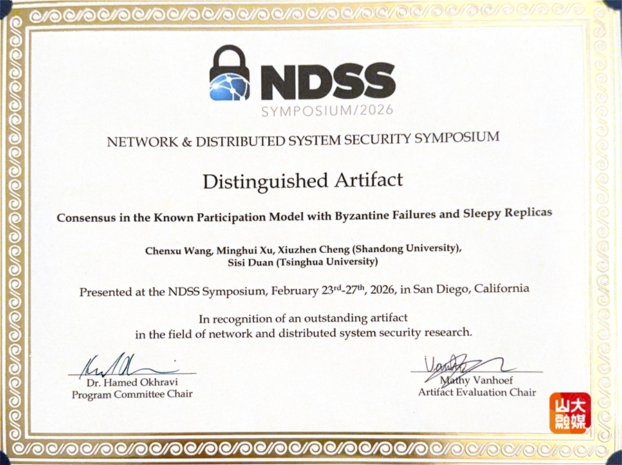 [本站讯]近日,网络与分布式系统安全顶级国际会议Network and Distributed System Security Symposium 2026(NDSS 2026)在美国加利福尼亚州圣地亚哥召开。山东大学计算机科学与技术学院隐私计算与智能安全团队的研究成果“Consensus in the Known Participation Model with Byzantine Failures and Sleepy Replicas”荣获大会杰出技术成果奖(Distinguished Artifact Award)。本次获奖是中国大陆高校团队首次获得NDSS会议的杰出技术成果奖。