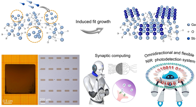 “诱导契合”方法成功突破了传统外延技术对晶格匹配的衬底或缓冲层的依赖。生长的镓基半导体薄膜结晶性良好、表面平整致密、可图形化。得益于非晶氧化镓独特的界面特性,所制备的镓基半导体晶体管表现了类脑神经突触行为模拟能力;所制备的360度全向柔性光电探测器在极低入射角及多次弯折条件下仍保持稳定的光响应,显示了卓越的环境适应性与弯折鲁棒性。该生长策略有望推动镓基半导体薄膜在高效光电转换、柔性电子、神经形态计算等方向的实际应用,为下一代物联网、智能传感、可穿戴设备等领域提供核心材料与工艺基础。