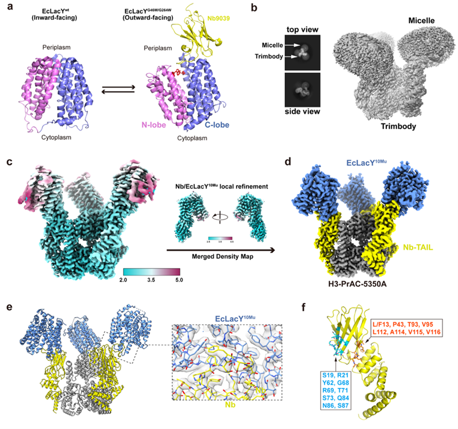 利用该系统,研究团队成功解析了四种分子量低于50 kDa的目标蛋白高分辨(3 Å以内)冷冻电镜结构,包括人源Gal10(2.62 Å)、Aequorea coerulescens来源GFP(2.29 Å)、人源Nectin4的IgV结构域(2.43 Å)以及膜蛋白大肠杆菌LacY(2.50 Å)。这些结构涵盖了可溶性与膜蛋白、不同结合模式的纳米抗体复合物,充分验证了Trimbody作为一个以纳米抗体为核心的普适性方法在多种小蛋白结构解析中的广泛适用性。Trimbody系统以其成本低廉、组装简单、与现有冷冻电镜工作流程的良好兼容性,为小分子量蛋白的高分辨率结构研究提供了新的通用工具,也为基于纳米抗体的药物研发及生命科学基础研究提供了重要支撑。该研究工作得到国家重点研发计划、国家自然科学基金、山东省自然科学基金等项目的资助。