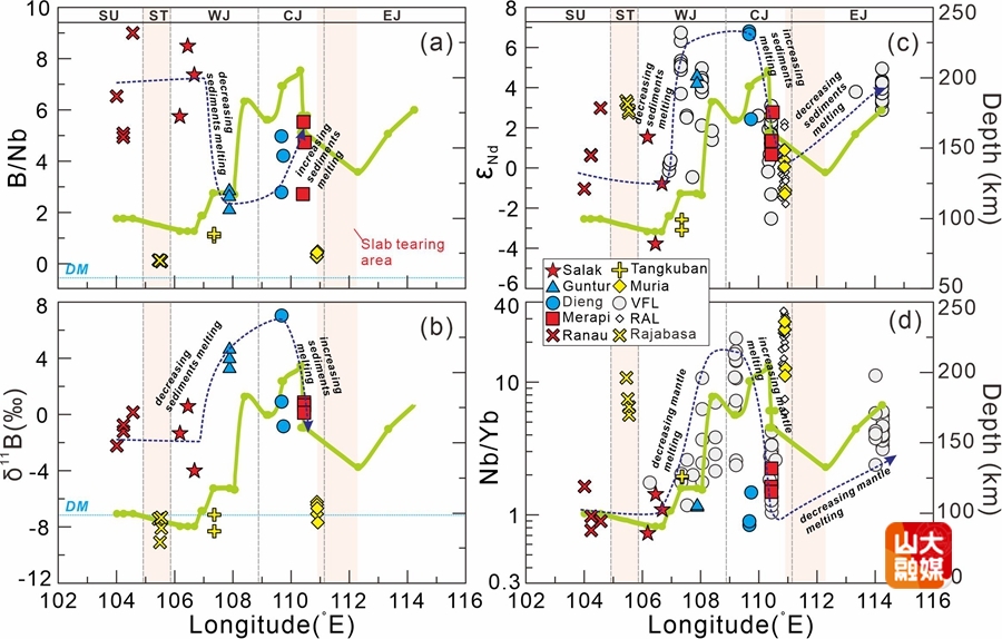 图1.爪哇岛岩浆化学成分与火山位置沿弧方向上存在明显的协同变化规律。