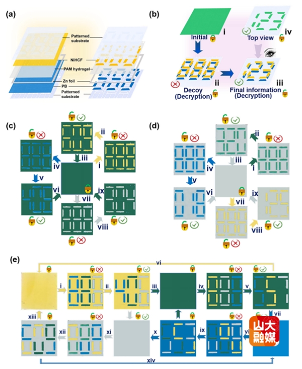 基于锌型电致变色器件的多功能信息加解密平台,可以实现从起始状态,诱饵状态,到最终真实信息的呈现。这一能够实现多色显示、按需调控及多模式加密的电致变色信息加密系统,突破了传统静态显示器依赖固定预设图案的局限性(图2)。