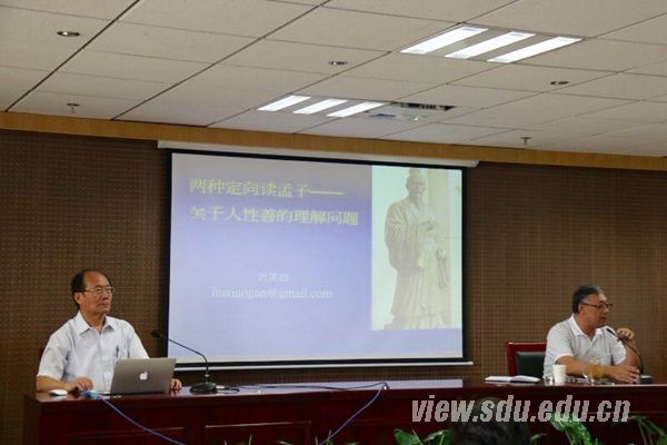 [本站讯]近日,山东大学哲学与社会发展学院朱雀讲坛在中心校区举行。国际著名道家学者刘笑敢作客本次朱雀论坛,并作了主题为“两种定向读孟子”的演讲。山大哲社学院暨中国诠释学研究中心教授、哲学系主任傅永军教授主持了本场讲座。共同参与本次讲座的听众有来自山东师范大学、曲阜师范大学等单位的教师、学者以及山大哲社学院与其他多个学院的师生。