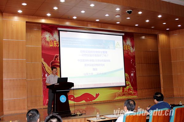 [本站讯]6月14日,中国实验动物学会第六届理事会常务理事,中国医学科学院医学实验动物研究所微生物室主任、博士生导师魏强教授应邀做客山东大学趵突泉校区,作了题为“动物实验安全管理——动物实验你准备好了吗?”的专题讲座。齐鲁医学部副部长王凤山、资产与实验室管理部副部长郁鹏参加,实验动物中心主任张爱国主持讲座。