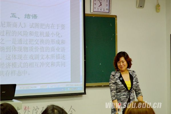 [本站讯]5月13日,由山东大学研究生院、党委研究生工作部主办,外国语学院承办的2016年第6期(总523期)“海右”博士生学术论坛在洪家楼校区举办。此次论坛有幸邀请到了外国语学院2014级英语语言文学专业在读博士研究生华有杰为主讲人。外国语学院副院长申富英担任点评嘉宾。本期论坛的主题为“《威尼斯商人》中三中经济模式”,外国语学院众多研究生参加了本次论坛。
