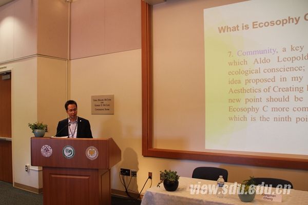 此次中美环境国际学术会议是山东大学与美方合作建立UCSB孔子学院以来,首次邀请中美学者共同参与的国际学术研讨会。研讨会内容包括主旨演讲和分论坛两个环节,涵盖了环境科学、环境经济学、环境政治、环境伦理以及环境与媒体等多学科和领域。山东大学文学与新闻传播学院程相占教授以“生态智慧C与治愈地球共同体的生态理性”为题、威海校区王亚民教授以“过度捕捞和海洋生物多样性保护在中国: 危机与对策”为题分别作了主旨演讲,经济学院张丽娟教授主持了“环境问题的政治经济”分论坛。加州大学媒体对此次会议进行了专访,圣芭芭拉市当地报纸、广播和电视等新闻媒体对此次会议做了专门报道。