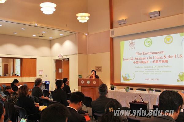 [本站讯]4月15日至16日,美国加州大学圣芭芭拉分校(UCSB)孔子学院成功举办“中美环境保护:问题与策略”国际学术研讨会。UCSB校长杨祖佑教授出席研讨会并致辞,来自纽约大学、南加州大学、密歇根州立大学、山东大学以及加州大学圣芭芭拉分校、洛杉矶分校、伯克利分校和圣地亚哥分校的50余名学者和社会各界人士参与此次会议。山东大学程相占教授、王亚民教授在会议上做了主旨演讲,中方院长张丽娟教授主持了会议分论坛。