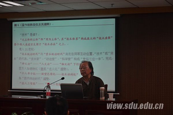 第一方面,张志扬教授通过马克思的物化理论开始阐发,引出技术发展去人类化的问题。他讲到,西方历史有一条路线,是一条下行线,由神性到最后的唯物。他认为技术是“无生命的主体” 即“用为主体”。其“技术体系”构成庞大的“技术座驾”,整个将人类凌空支架于“技术存在”之上。进入21世纪,“技术统治时代”与“资本统治时代”仍处于同等互动的位置。“技术”或“资本”的代表,“资本家”、“政治家”、“科学家”构成了“世俗三位一体”来完成下行路线。西方人的加速物化即彻底“去人化”的趋势正是为“技术统治时代”做铺垫。