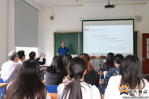 [本站讯]5月11日,广东外语外贸大学英语语言文化学院院长、博士生导师温宾利教授做客山东大学外国语学院,为师生作了题为“英语之钢当如何炼成”的学术讲座。讲座由外语学院院长王俊菊教授主持。