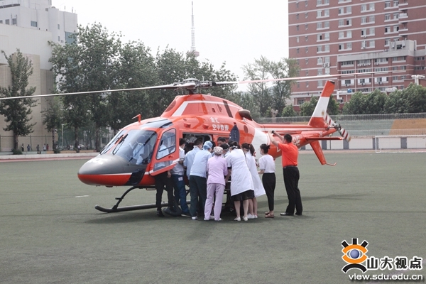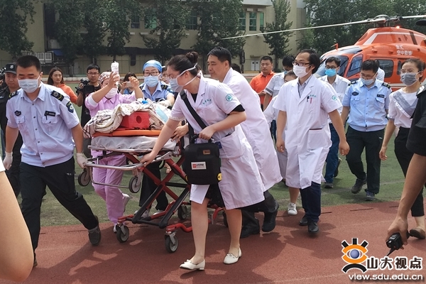 5月29日上午,转运直升机从济宁市人民医院起飞,一小时后安全平稳地降落在山东大学趵突泉校区操场上。医护人员、救护车早已等候多时,救护车上配备了最先进的转运监护、转运呼吸机、除颤仪等急救设备。医护人员争分夺秒、有条不紊地将患者转移至担架上,推上救护车,仅用了8分钟时间便将患者护送至急诊重症监护室(EICU),并立即对其进行抢救、评估监护。急诊科主任徐峰介绍,心脏重症患者病情危重,长途陆地转运更存在中途心脏骤停等意外风险,空中转运比起陆上转运极大地节省了时间。齐鲁医院副院长、急诊科学科带头人、胸痛中心主任陈玉国表示,空中救援是一种新出现的快速、高效、及时的转运方式,齐鲁医院目前接诊了两例空中救援患者,空中救援可在半个小时左右内实现,这个时间是对患者非常重要的抢救期,有效地保护了患者的器官功能,为下一步治疗赢得了时间,提高了患者生存的机会。