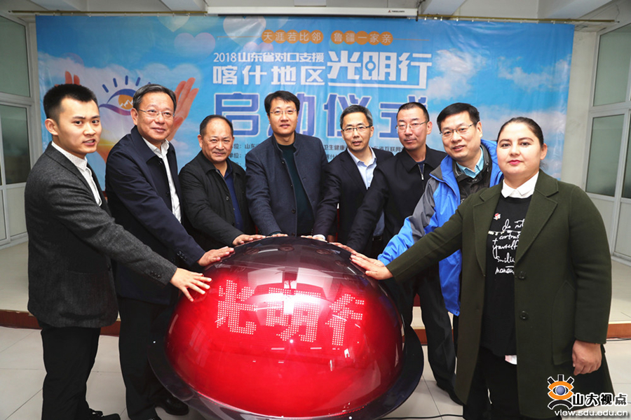 仪式现场,山东省援疆指挥部党委副书记、喀什地委组织部副部长邓泽宇,山东大学第二医院党委副书记、纪委书记葛楠,喀什地区卫生计生委党委书记、副主任彭银星,岳普湖县委常委、宣传部部长依明古丽·亚森,山东省互联网传媒集团大众网健康频道主编帅伟共同按下启动球,正式启动“2018喀什光明行”活动。邓泽宇表示,21年来,山东省认真贯彻中央治疆方略和鲁疆两地党委政府决策部署,形成了多层次、宽领域、全方位的对口支援格局,在南疆这片土地上留下了深刻的山东印记。医疗卫生援疆是援疆工作的重要内容,是直接服务于基层群众、挽救生命、温暖民心的民生工程。山东援疆指挥部牢固树立“抓卫生就是抓民生,保健康就是保稳定”的工作思路,不断寻求新突破,总结新经验,确保新成效。葛楠表示,作为百年老校山东大学的附属医院,也是国家卫生健康委委属委管医院,山东大学第二医院历来注重履行社会责任,高度重视对口支援工作,积极开展公益帮扶活动。此次活动,医院派出以眼科主任张晗教授为核心的骨干力量组成援疆医疗队,采用的晶体全部来自进口,手术耗材和设备也由山东济南空运到新疆喀什,医院全力支持配合好活动的开展。