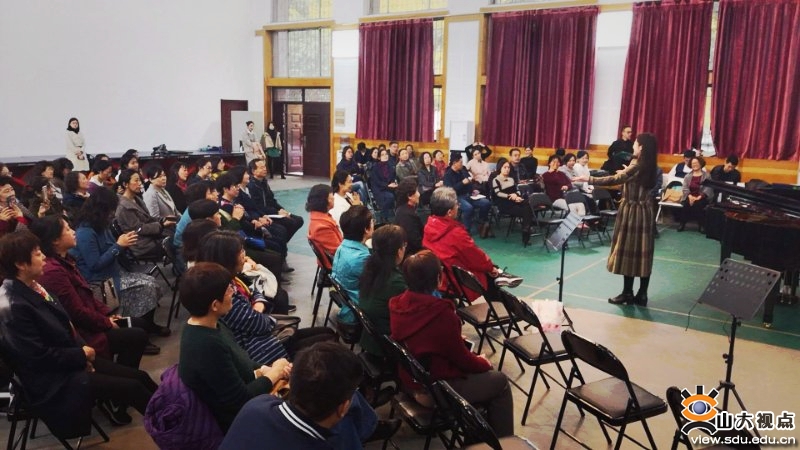 声乐班邀请山东大学艺术学院刘娜教授担任主讲,共为学员们精心安排了1次声乐观摩、6次现场教学以及1次学员舞台展示。首堂声乐观摩课,刘娜教授指导艺术学院多位学生担任助教,进行现场演唱,让学员欣赏中国民歌、电影插曲、中外艺术歌曲、中外咏叹调、创作歌曲等共计17首歌曲,并为学员讲解了歌曲背景、声音技巧的处理方法,使学员直观地感受到因地域差异或歌曲类型不同而带来的唱法区别。接下来的6次课程将以声乐小组课为主,针对学员们的不同基础、不同条件因材施教,选取有代表性和针对性的作品采取独唱、对唱以及小合唱等多种形式教学,充分调动学员参与热情与积极性,并在最后一次课程中安排学员进行舞台实践,促进学员间的艺术交流,提供展示自我的舞台。