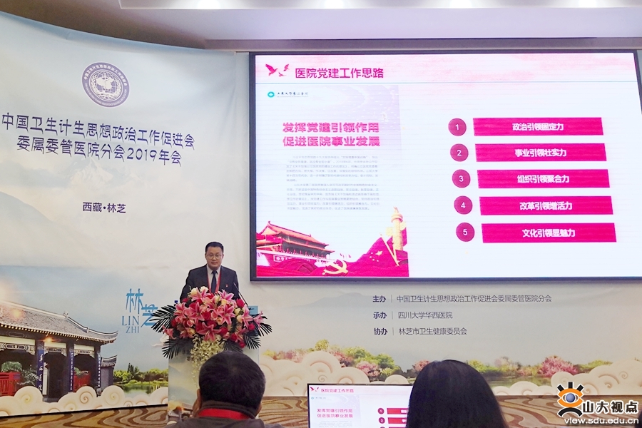 [本站讯]6月21日,中国卫生计生思想政治工作促进会委属委管医院分会2019年会在西藏举行,山东大学第二医院党委委员、党委办公室主任孙永国出席会议,并在会上作了题为《新时代公立医院党建工作人员能力提升》的经验交流。
