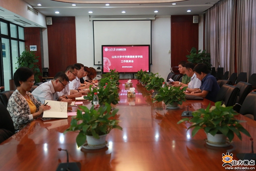[本站讯]8月29日下午,中华美德教育学院在洪家楼校区继续教育学院会议室召开工作联席会。会议总结了中华美德教育学院前期开展的工作,研究讨论了中华美德教育学院规划及近期主要工作,明确了下一步工作重点。中华美德教育学院党委书记李平生,中华美德教育学院执行院长靳光华,儒学高等研究院副院长徐庆文,继续教育学院副院长沈翔、刘灿伟,儒学高等研究院挂职副院长陈诚出席会议。会议由靳光华主持。