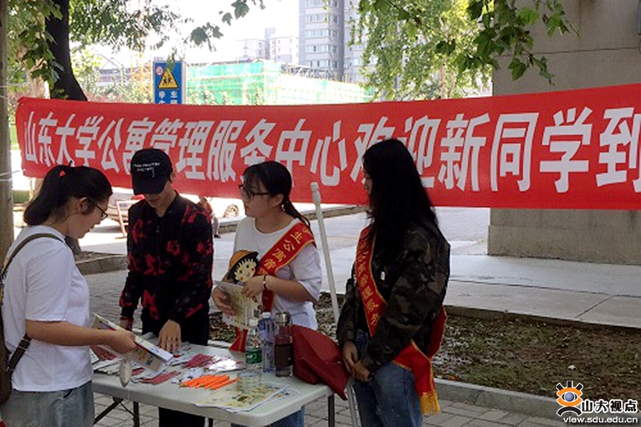 学生公寓是大学生的第二个“家”。为了营造温馨和谐的迎新氛围,学生公寓管理服务中心紧紧围绕着人文关怀,加大了公寓文化宣传力度:利用楼内的电视及LED 电子屏播放“山大欢迎你”等迎新视频,并在每栋新生公寓楼悬挂“扬山大青春,畅中国梦想”等横幅,无不显示了公寓老师们对新成员的美好寄托。