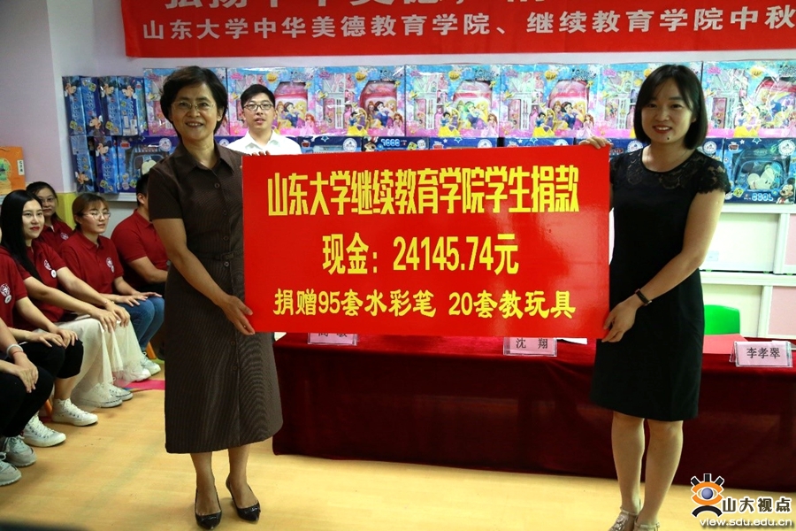 [本站讯]9月11日,山东大学中华美德教育学院、继续教育学院携手济南市启明星儿童康复中心开展“弘扬中华美德,情系‘慢飞天使’”中秋节爱心公益活动。山东大学继续教育学院副院长沈翔参加活动。
