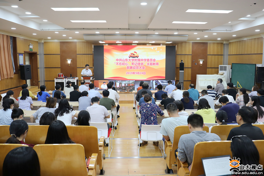 [本站讯]9月24日下午,山东大学附属中学在洪楼校区报告厅召开“不忘初心、牢记使命”主题教育动员部署大会,学习贯彻中央“不忘初心、牢记使命”主题教育工作会议和习近平总书记重要讲话精神,对附属中学开展主题教育进行动员部署。山东大学附属中学党委书记李玉亮作部署,大学第五指导组组长朱桂英、副组长高弟出席会议并讲话。山东大学附属中学校长赵勇主持会议。