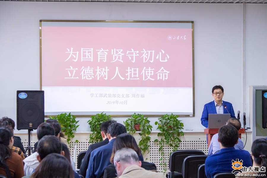 随后,周作福向大家介绍了学校推进“三全育人”工作的主要进展。一是完善顶层设计,二是明确育人职责,三是进行全员发动,四是争取各种力量,五是力推课程思政,六是关注本质需求,七是打造工作品牌。但在工作中仍然存在政治站位不够高、思政工作融入不深入、育人体系构建不完善、有效供给不充足、只争朝夕,追求卓越的精气神还不够等问题。在下一步工作中需要坚持边学边查、边查边改,直面问题不回避,推动问题整改落实到位。一是要提高政治站位,二是要增强育人意识,三是要强化中心地位,四是要完善育人体系,五是要强化有效供给。坚持为党育人、为国育才,发扬和传承山东大学红色基因,坚持集中精力、提升能力、凝聚合力、展示魅力;坚持学术导向、创新思维、特色纷呈、全面发展;坚持坚定举旗、用心铸魂、严谨治学、精准助困;落实立德树人根本任务,提升育人实效,帮助学生成长,让每一个山大学子都努力成为最优秀的自己,让每一个山大学子都努力绽放自己的光彩。