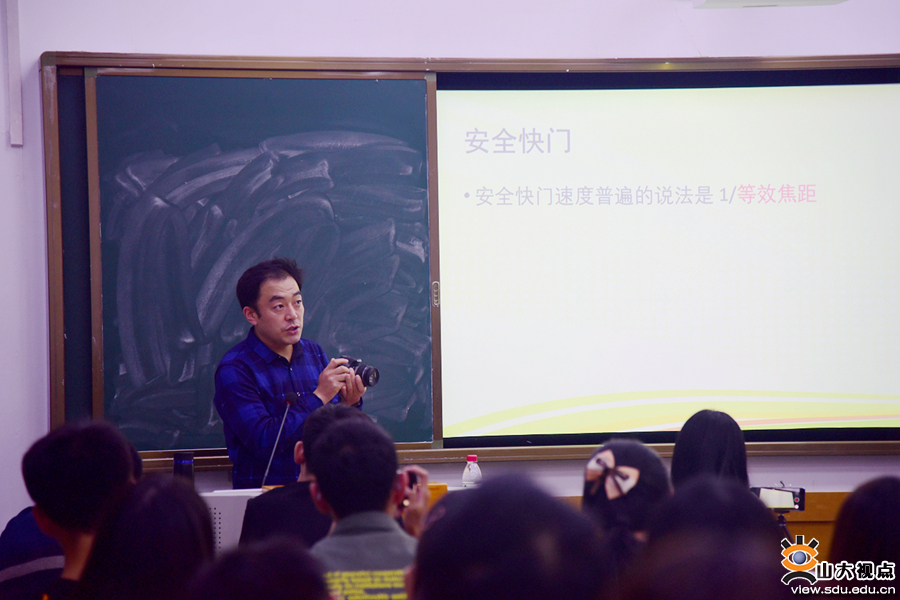 23日的讲座中,宋洪晓深入细致讲解了摄影技术基础知识以及校园风光摄影技巧。他详细讲解了快门、光圈、焦点与弥散圆、景深等的定义及参数调整等技巧,并介绍了摄影中倒易律以及1/3档参数调整、测光方法和“阳光16法则”。最后,宋洪晓介绍了风光摄影的构图、光影、HDR、接片等技术,以及天气对风光摄影的影响。讲解过程中,宋洪晓通过现场的拍摄实践和示范加深大家对理论知识的理解。讲解结束后,宋洪晓回答了现场师生提出的在新闻摄影实践中遇到的各种问题。