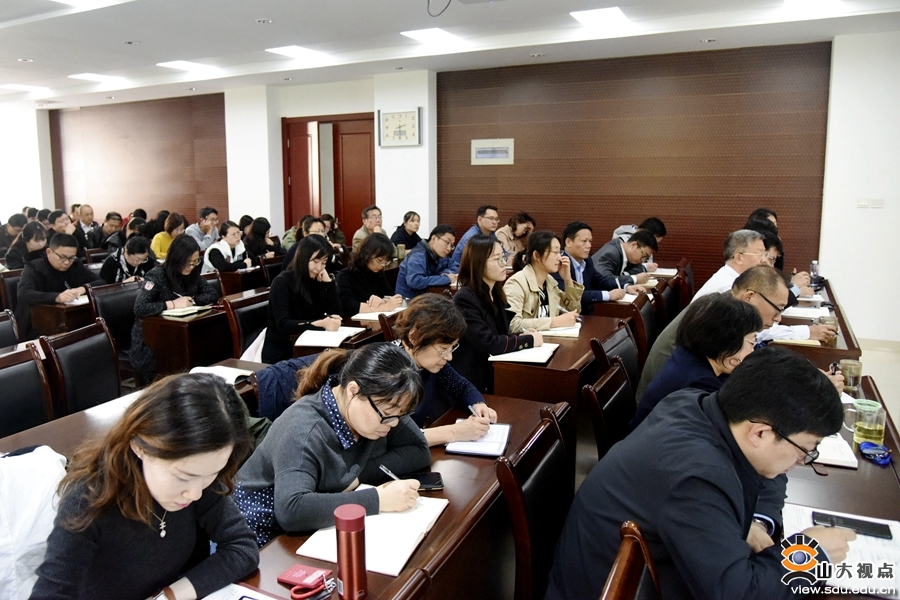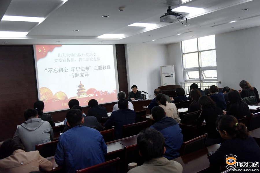 [本站讯]10月31日下午,山东大学出版社党总支与党委宣传部、教工部党支部“不忘初心、牢记使命”主题教育专题党课举行。校党委常委、宣传部部长、教工部部长、出版社党总支书记桑晓旻作了题为《不忘初心,勇担使命,建设具有强大凝聚力和引领力的社会主义意识形态》的党课报告。