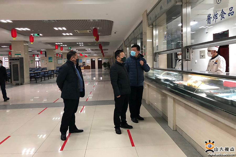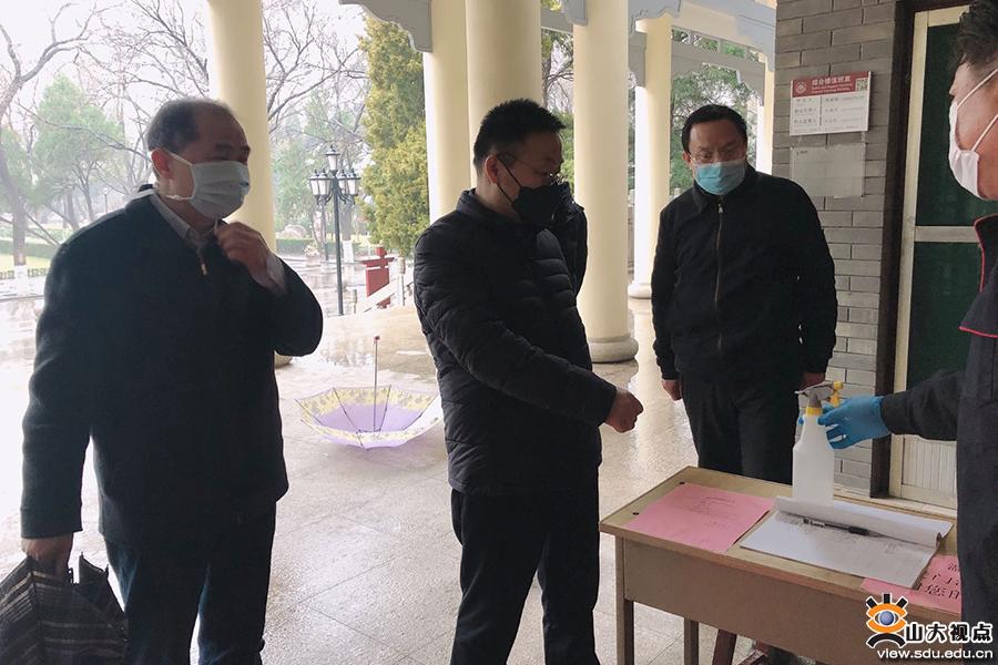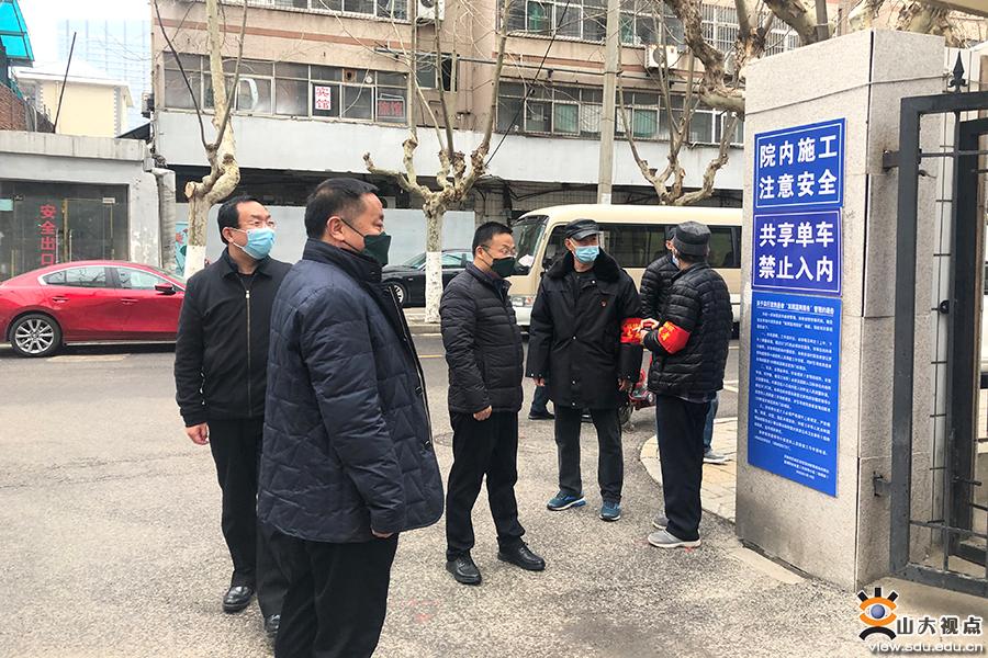 殷录民一行仔细察看了洪家楼校区、趵突泉校区、千佛山校区的教职工宿舍区门值、校园部分楼宇门岗、食堂、工地等十余个场所。实地详细了解各单位执行“后勤保障部防控新冠肺炎工作方案”,落实“一楼一案”工作情况,重点查问人员管理与配备、门值责任、物资发放、个人防护、复工预案等问题。殷录民在检查中表示,门值人员要严把社区、楼宇入口关,按照学校和社区规定严格职守,一丝不苟,压实做好防控第一道关。要做好人员合理配备,创新工作方法,安排好一线工作人员的工作、休息时间,发动学校老党员、志愿者作用,开展群防群控,为学生返校做好人员储备。校园公共区域管理要不折不扣地执行“一楼一案”工作流程,逐一落实每一层、每一间、每个点消杀方案。按照前期演练的程序,优化人员分工、工作程序,保证工作质量,提高工作效率。关心爱护后勤一线工作人员,做好一线工作人员物资保障和个人防护,开展各类人员、各工作分工的专业培训,提高个人防护能力,防止人员损伤。切实细化修缮工程复工方案,做到每一个工程、每一个施工人员防控无死角、无盲点,实现工程数量清、人员清、健康状况清、人员行踪清。
